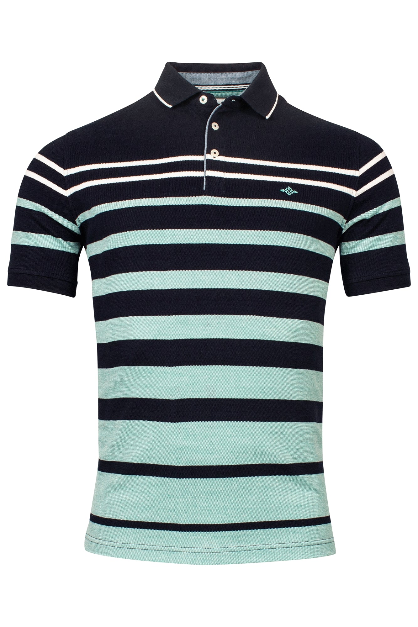 * Navy polo with green and white stripes.