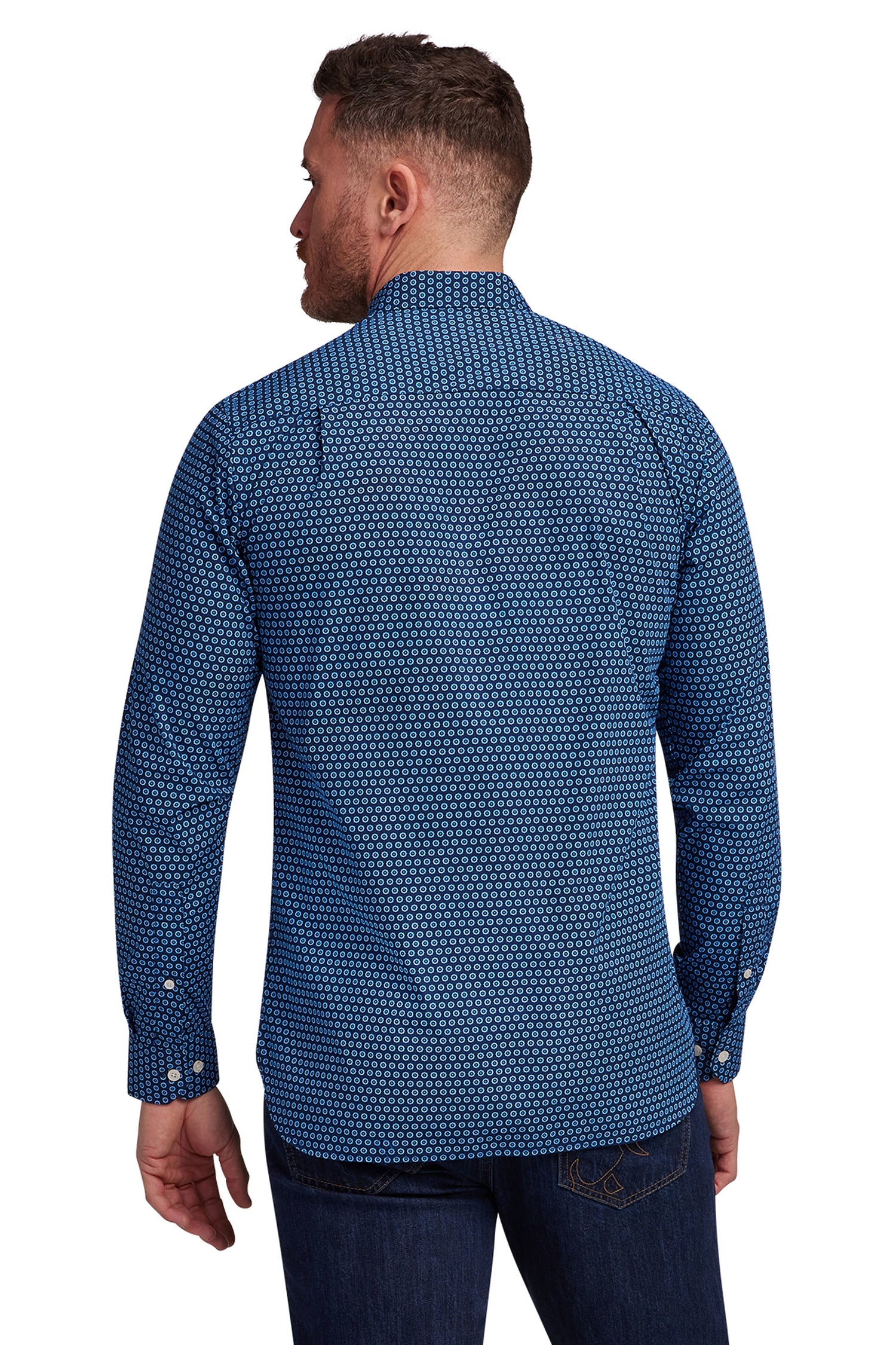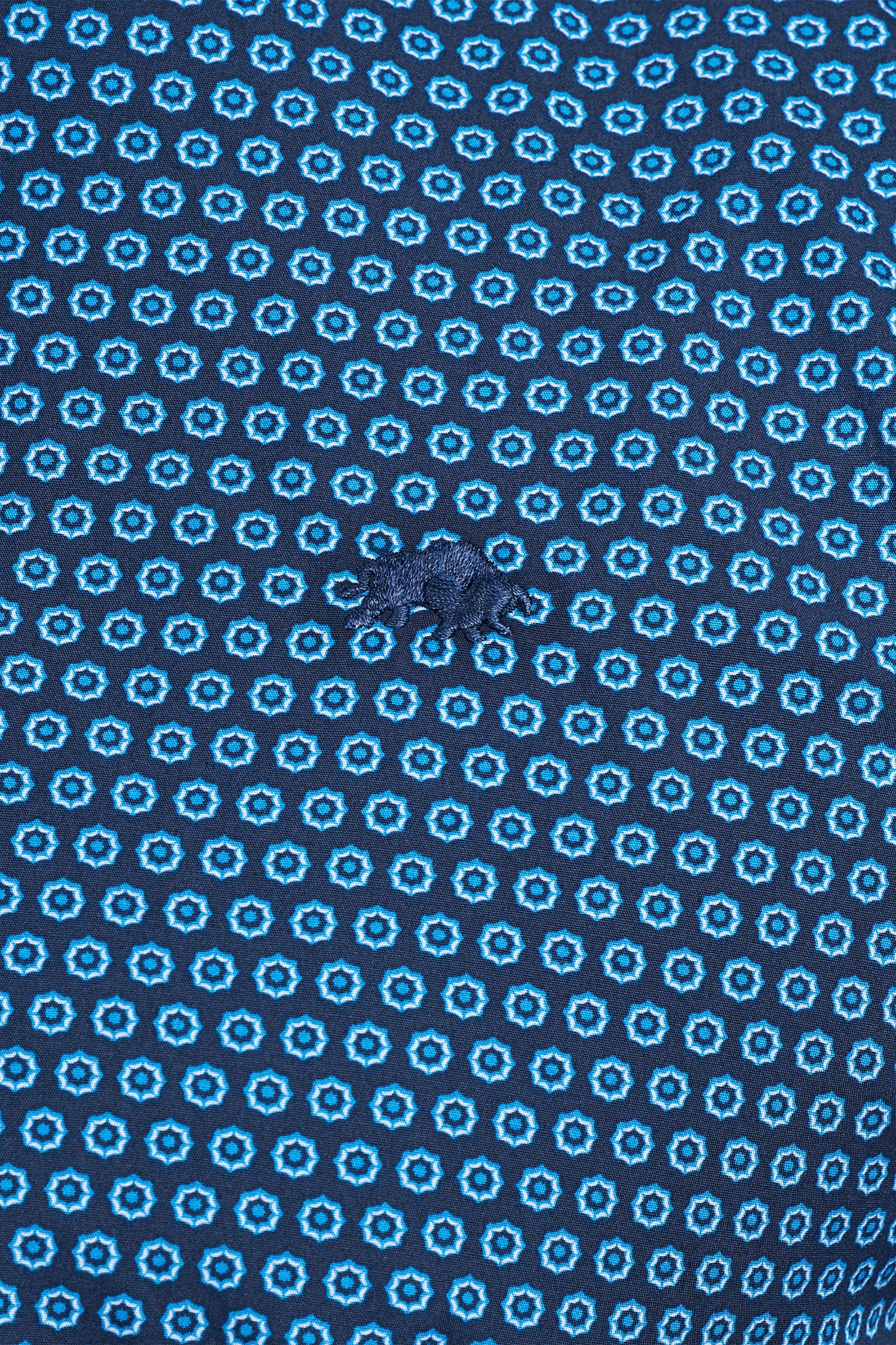 * Navy geometric pattern shirt with buttoned down collar.