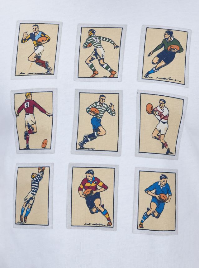 * White tee with vintage rugby cards print.